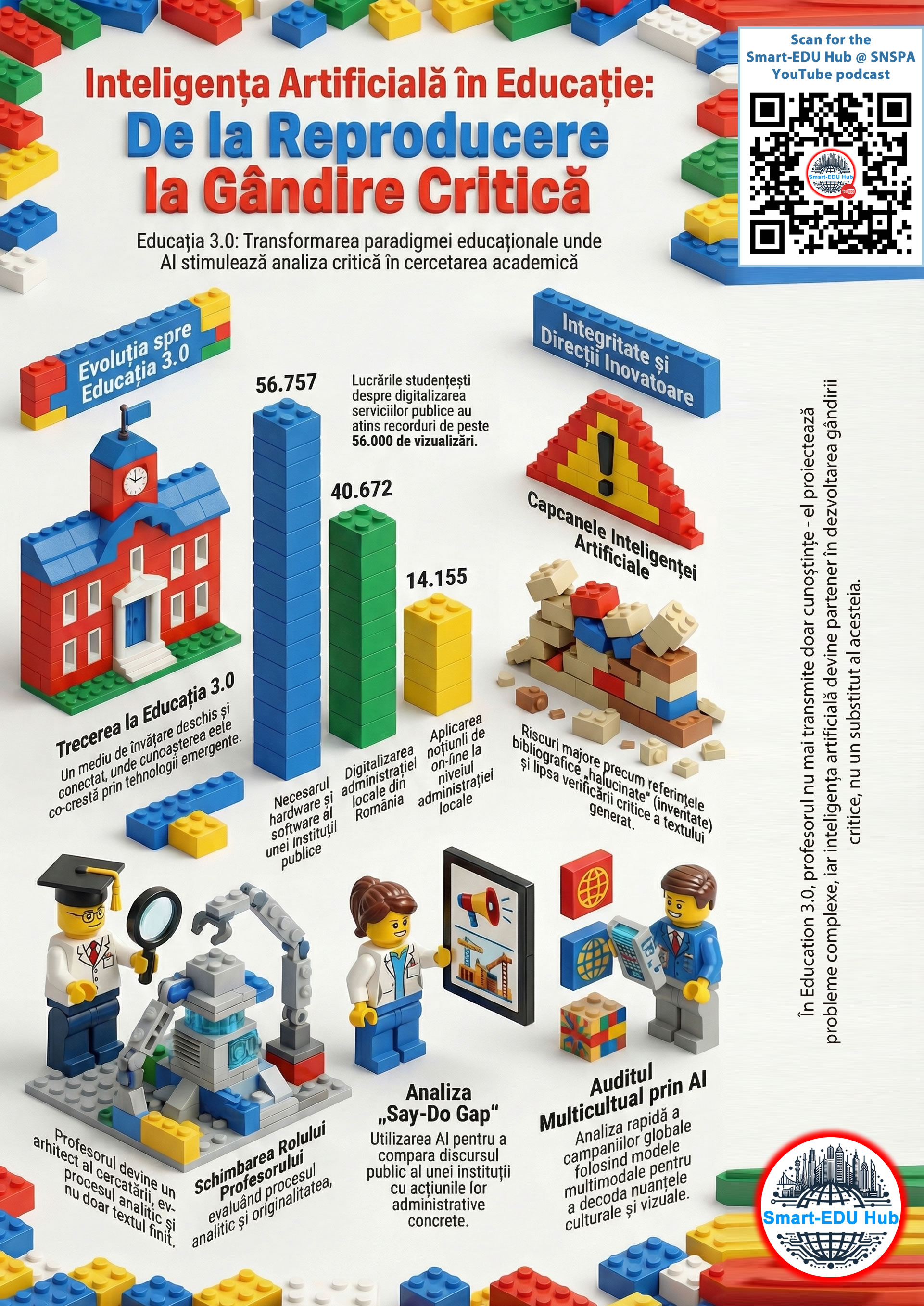 This collection of posters and infographics explores key themes in Artificial Intelligence through a structured and accessible visual format grounded in articles published in All In on Tech, the science news magazine of the Smart Cities and Regional Development Digital Library. Each poster distills contemporary technological developments and societal implications of AI into clear visual syntheses intended to stimulate critical engagement. Every infographic is complemented by a dedicated YouTube podcast episode hosted on the Smart-EDU Hub @ SNSPA channel, accessible by scanning the QR code displayed on each poster.